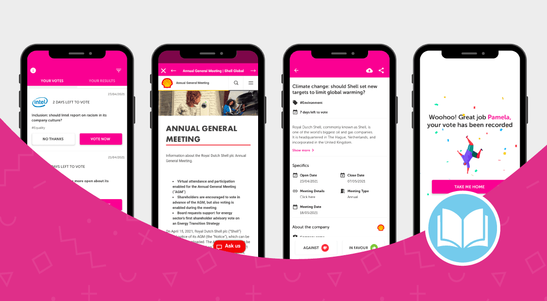 When a vote related to your selected ESG topics is available, you'll be notified and it'll appear under the 'your votes' feed within the app. From there, you'll be told when the vote expires, you can dismiss the vote without taking any action, review and download full details about the vote and then finally share your preference in favour or against.